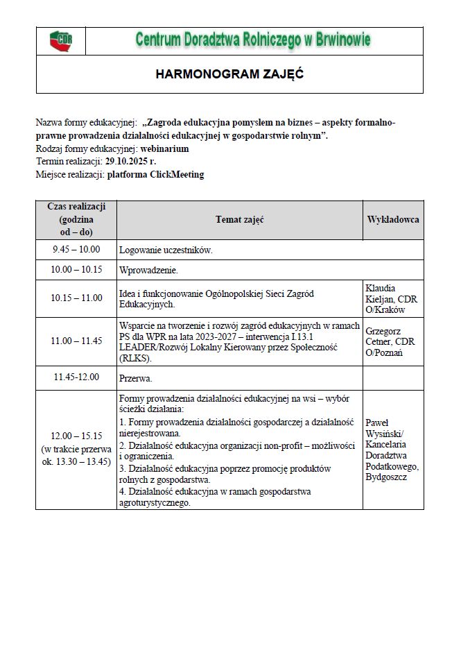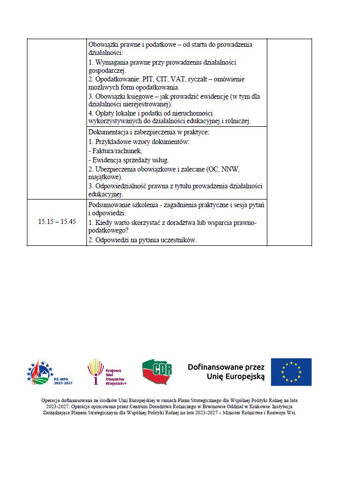 • uczestnicy uzyskają aktualną i praktyczną wiedzę z zakresu formalno-prawnych aspektów prowadzenia działalności edukacyjnej w gospodarstwach rolnych,